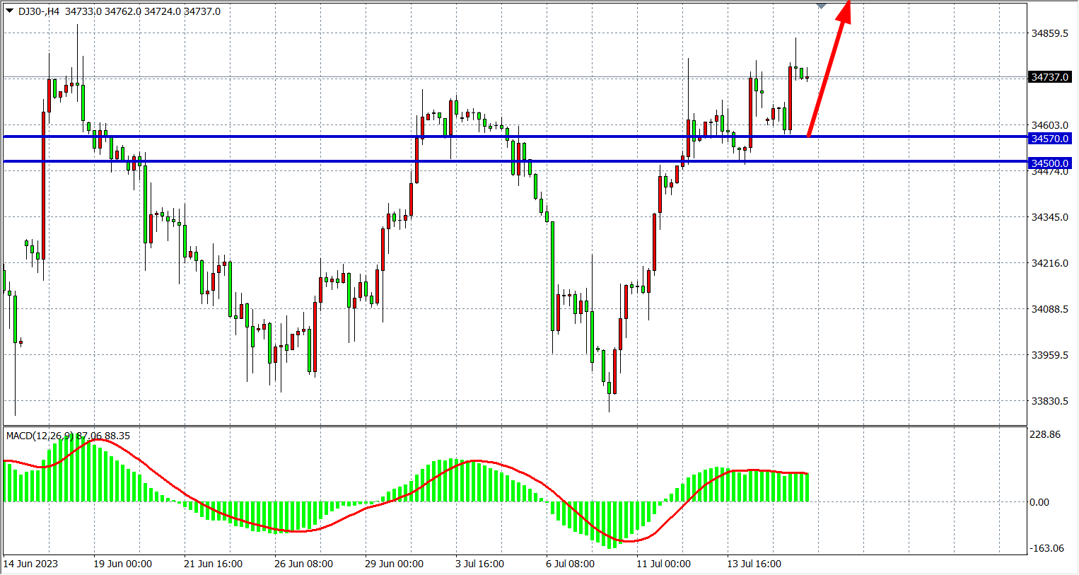4小时图看,道指在34500之上继续走高,MACD量能维持零轴上放量,支撑上移34570附近,阻力34800-35000。