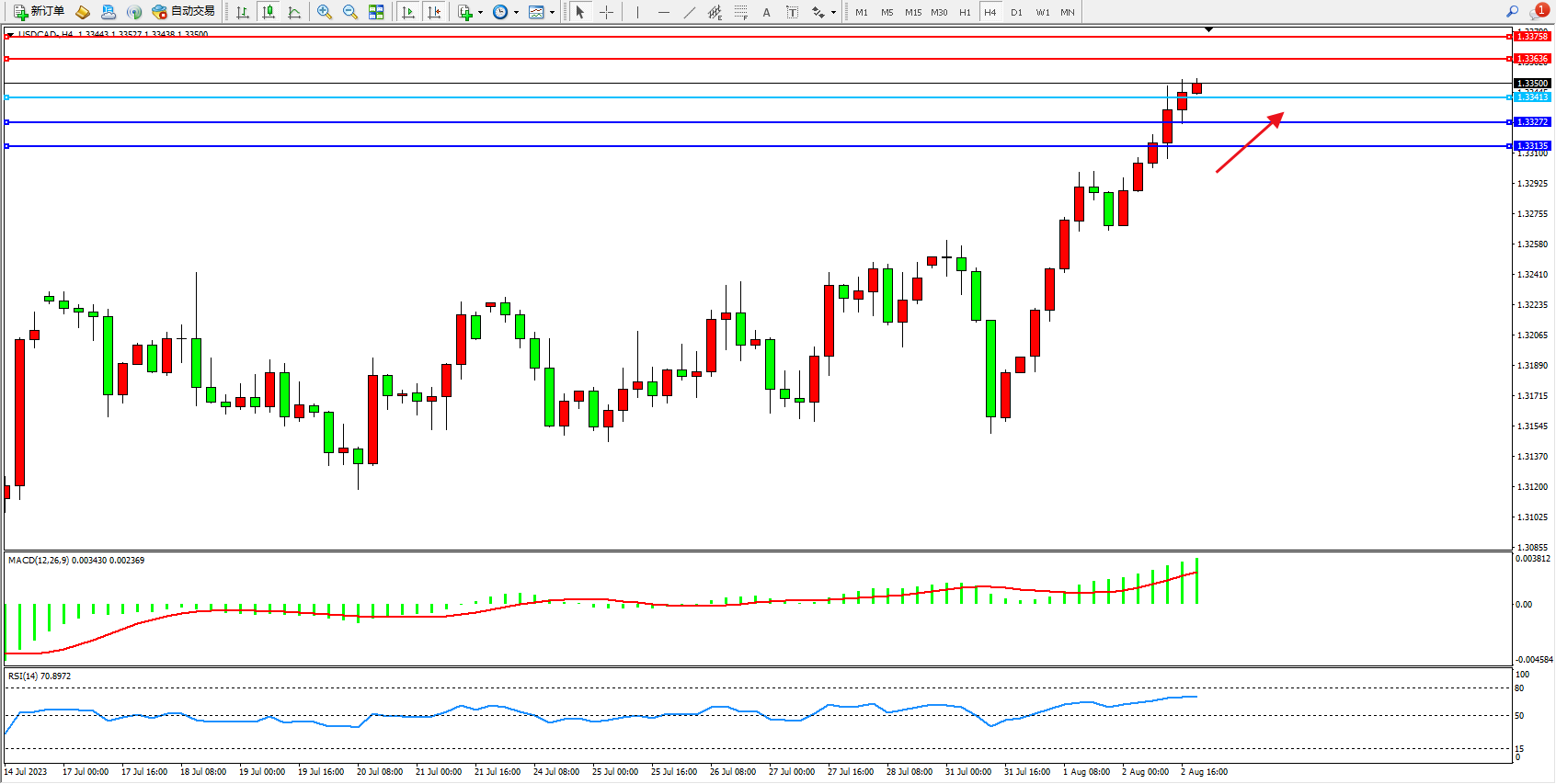 美元加元USDCAD——4小时K线图显示: