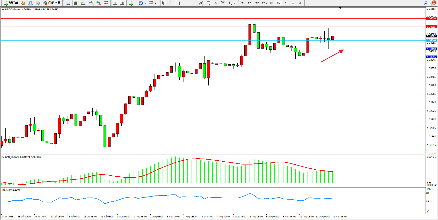 美元加元USDCAD——4小时K线图显示: