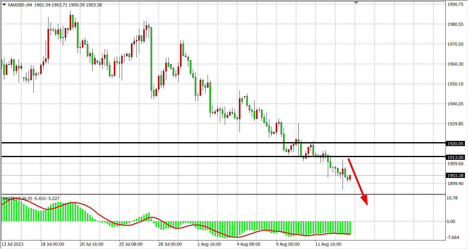 4小时图看,黄金进一步跌至1900关口,MACD量能延续零轴下,走势维持空头行情,阻力继续关注1913-1920附近,支撑关注1900-1880。