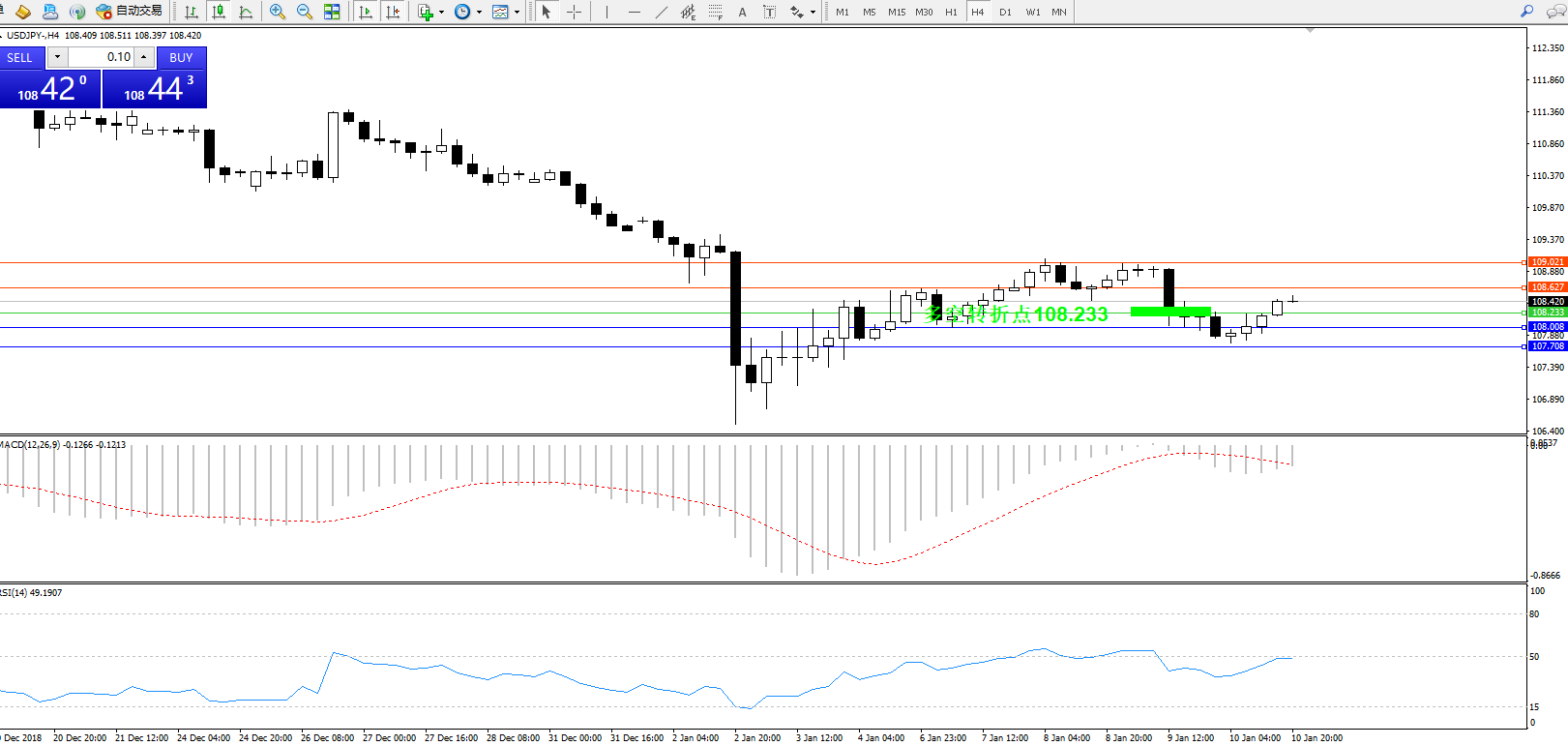 交易策略:108.233上方看涨,目标108.627、109.021