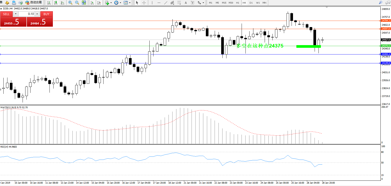道琼斯指数DJ30—— 4小时K线图显示: