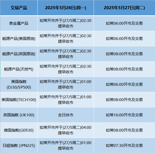 因应2025年5月26日(周一)为美国假期及英国银行假期关系,本公司以下产品的交易时间将于假期期间作以下安排,敬请留意。