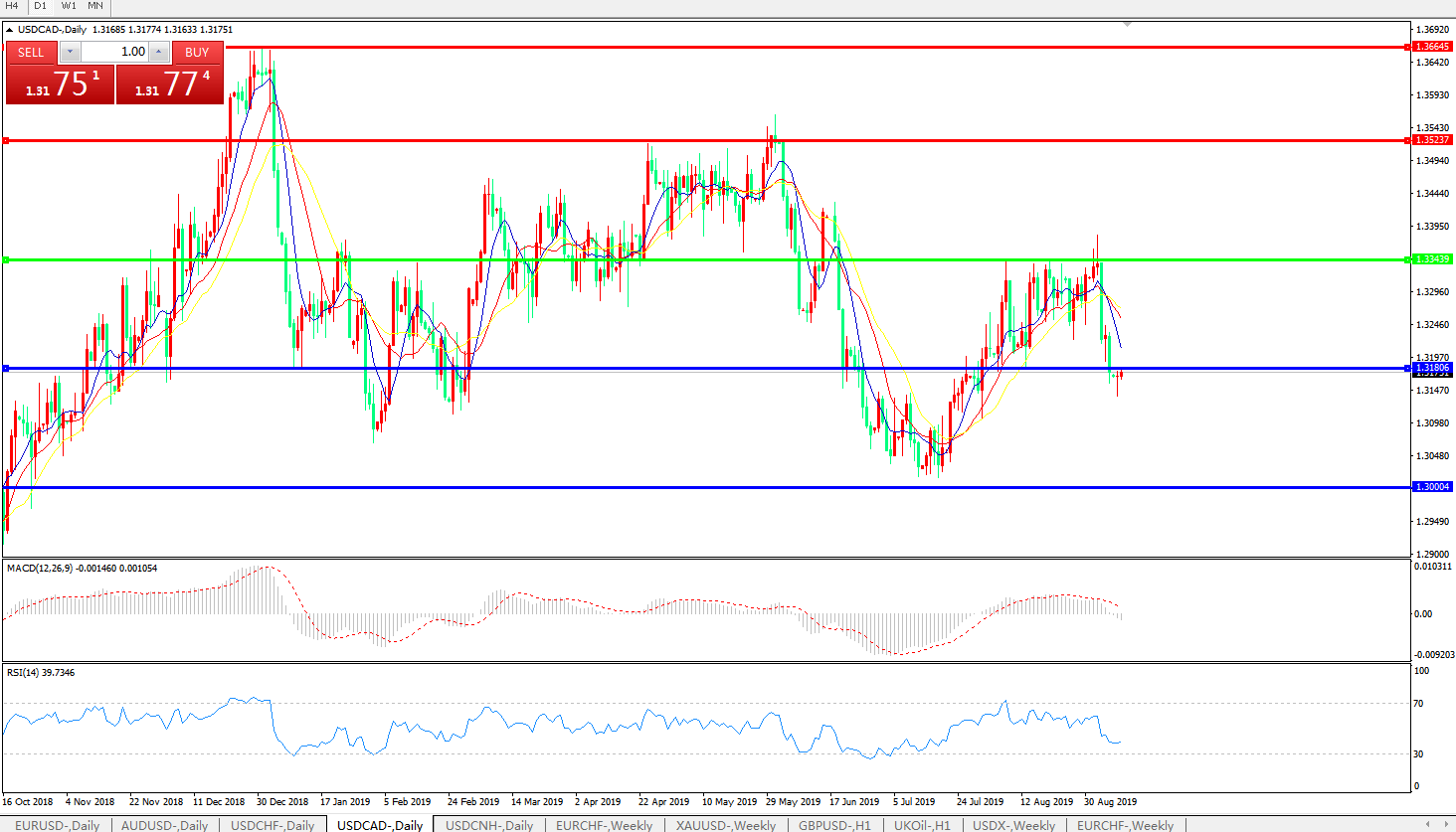 技术面简析:日线图均线呈下行态势,汇价昨日继续下跌尾盘有所回升,MACD于0轴上方拐头下行且量能0轴下方显现,RSI逐步走低,预计短期汇价有进一步下行空间。