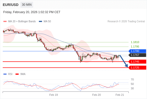 欧元/美元 当日内: 短期关键阻力位在1.1780。