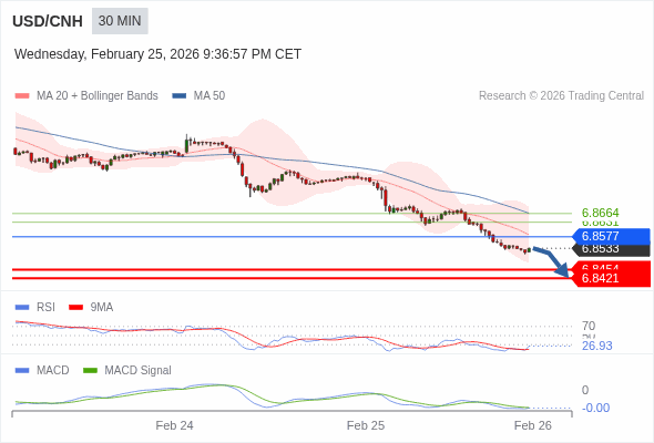 技术点评: RSI技术指标小于30。在这种情况下,说明有很强的下跌趋势,或者意味着处在超卖的状态下,可能会有向上的反弹。我们将观察RSI技术指标是否出现背离现象。 MACD技术指标处在其信号线之下看空。 配置为负。 此外,价位低于其20天及50天移动平均线 ( 分别位于6.8585 和6.8665 )。