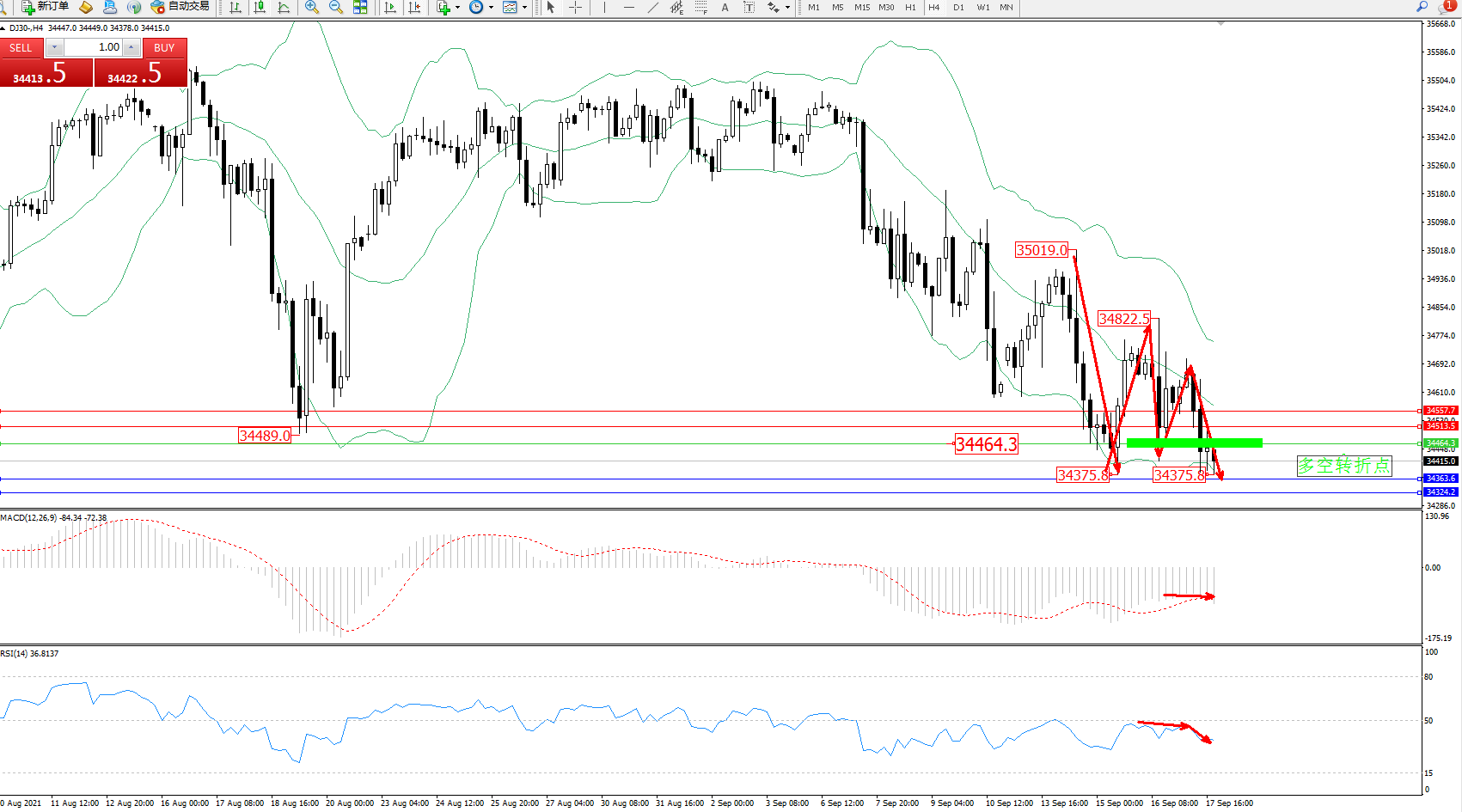 道琼斯指数DJ30——4小时K线图显示: