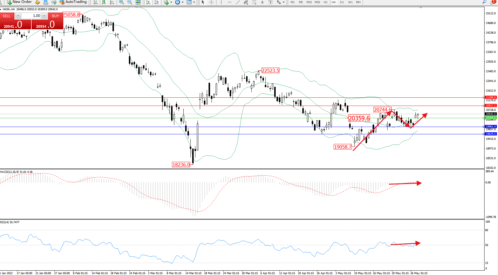 恒指HK50 ——4小时K线图显示: