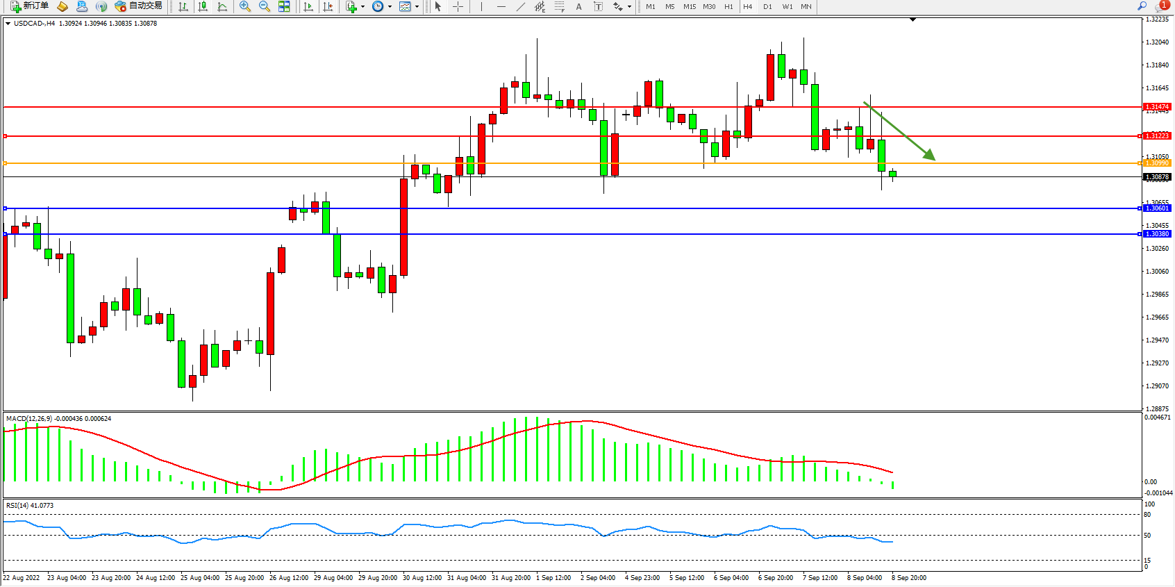 美元加元USDCAD——4小时K线图显示: