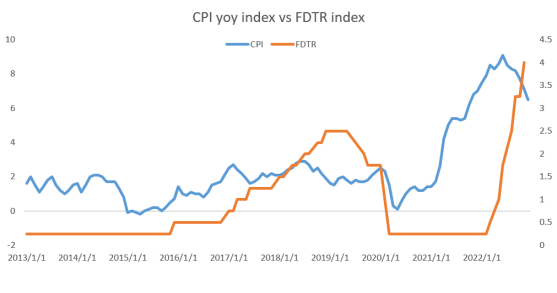 通货膨胀与货币政策。从下图来看,两者的负相关很明显,CPI与美联储加息确实有效,CPI持续下降,那么美联储的加息节奏应该是放缓的。从国际货币基金组织的最新预测来看,尽管对今年的预测比2019年以前平均值要低,但是仍然要好于去年。由于对全球经济衰退和通货膨胀的忧虑情绪已经开始减弱,投资者对美联储以及各国央行的加息节奏和尺度也在调减预期。