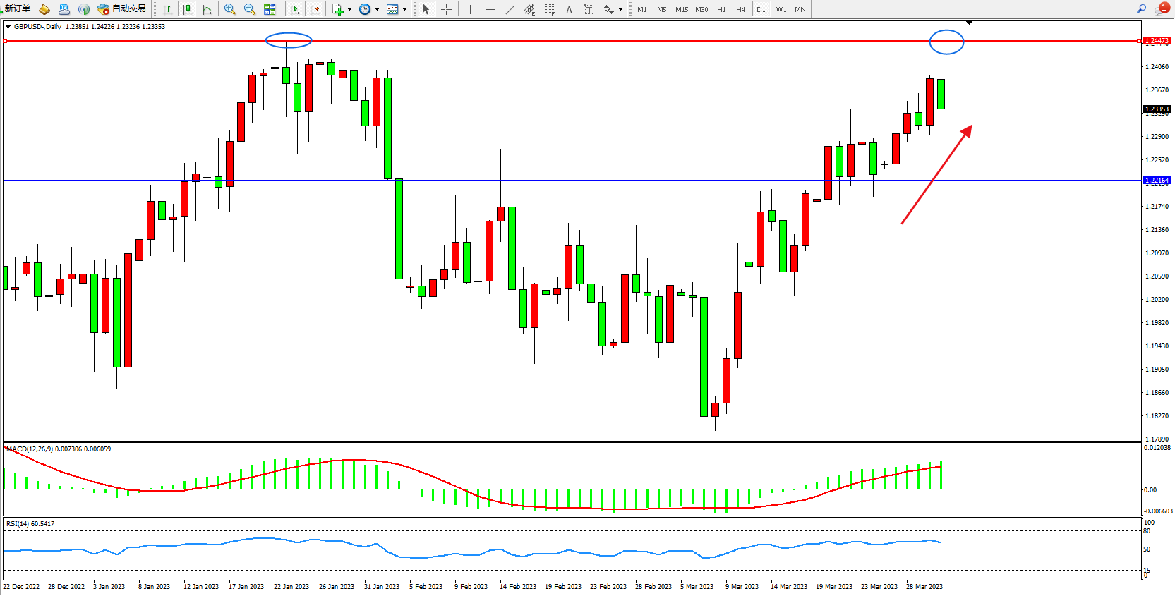 英镑兑美元上周上涨逾1%,重新升破1.24关口,并有望连续第二个季度上涨,英镑兑美元将重新测试2022年底/2023年初的峰值1.2447。