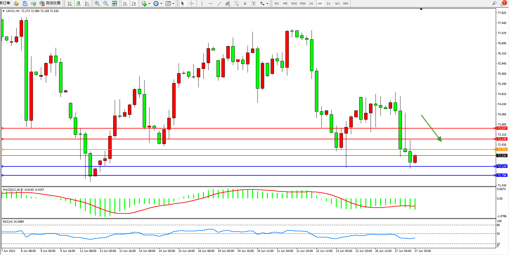 交易策略:72.753下方看跌,目标72.128 71.798