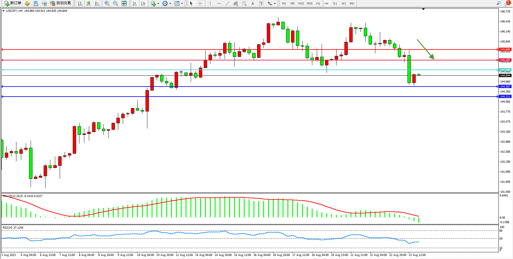 备选策略:145.000上方看涨,目标145.287  145.600