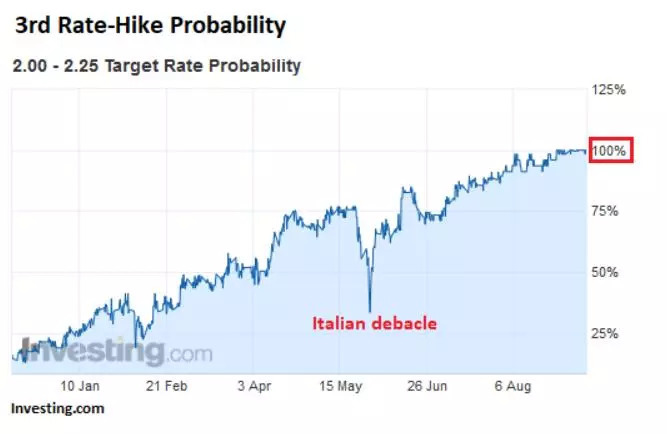 在年初时,市场认为美联储不会一年加息四次,甚至还有降息的言论,因为当时股市曾一度大跌。但是现在,市场对美联储在今年12月的18-19日的议息会议不再抱有幻想,认为加息是大概率的事情,届时中性利率会提升至2.25% - 2.50%之间。